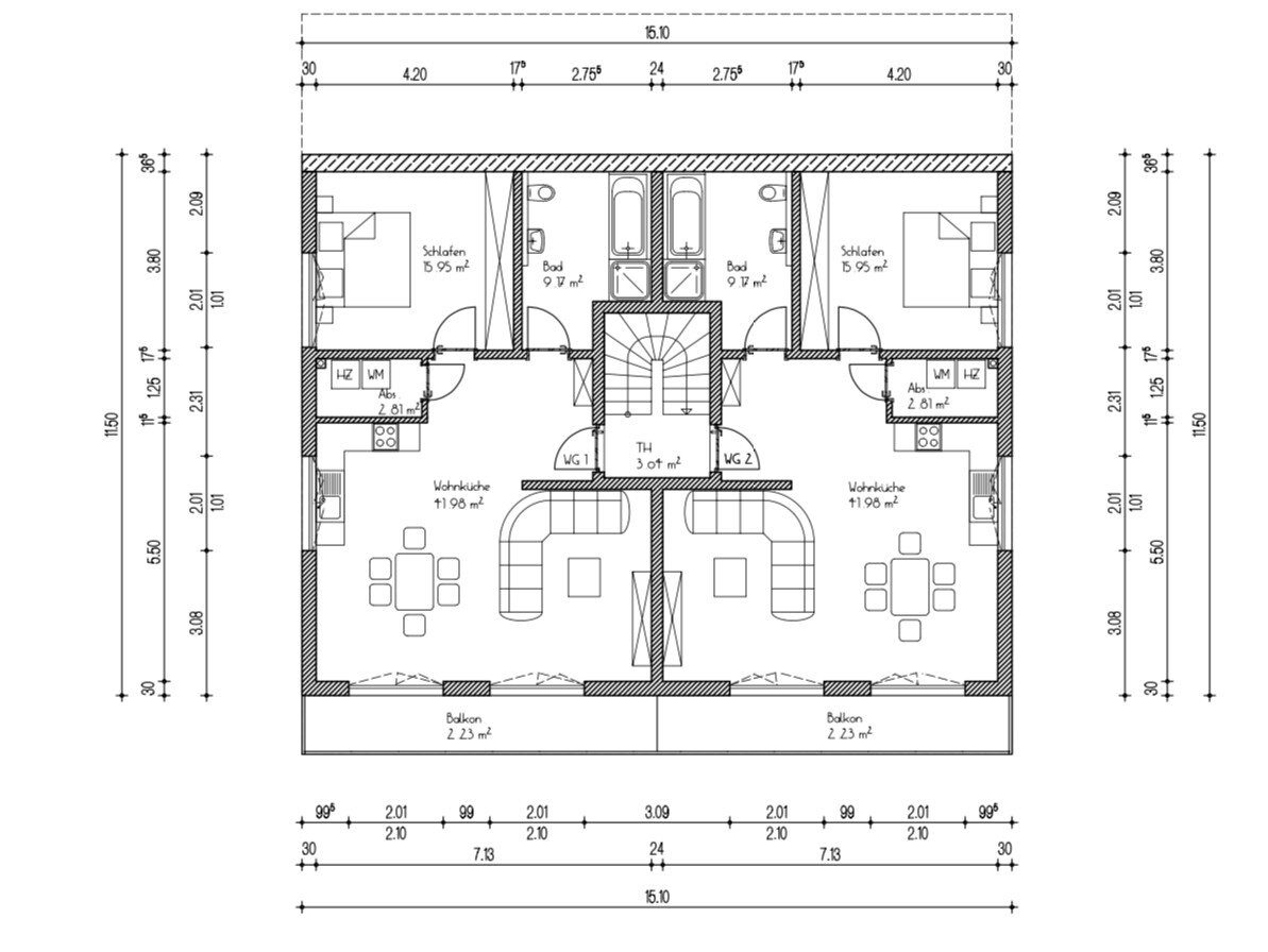 Die 5 Wohnungen sind dabei auf drei Etagen aufgeteilt: Erdgeschoss, erstes Obergeschoss und Dachgeschoss. Aufgrund der Hanglage befindet sich dabei des Erdgeschoss erhöht auf Obergeschossebene (siehe beigefügter Querschnitt).