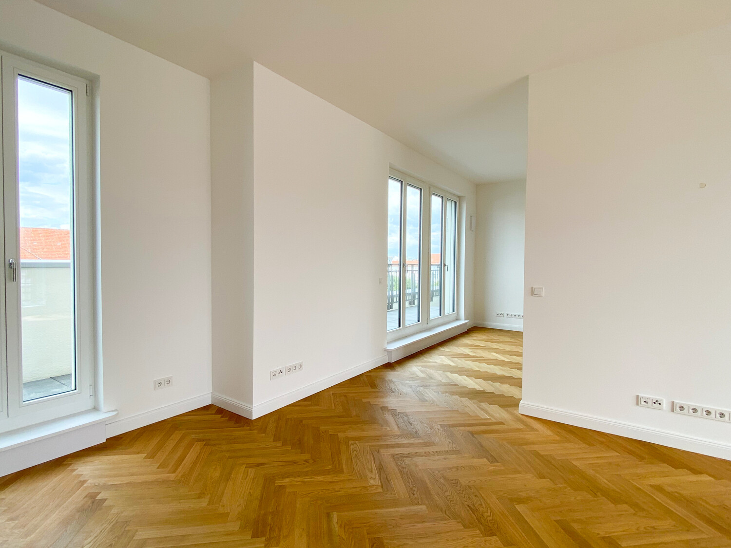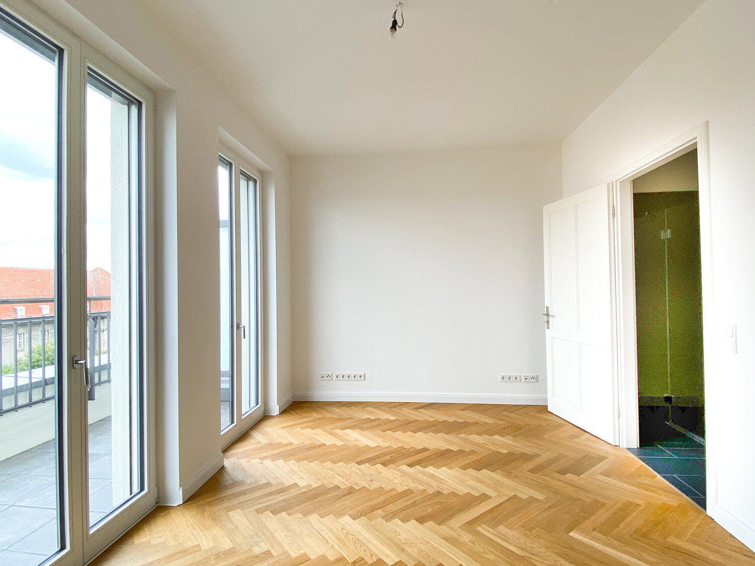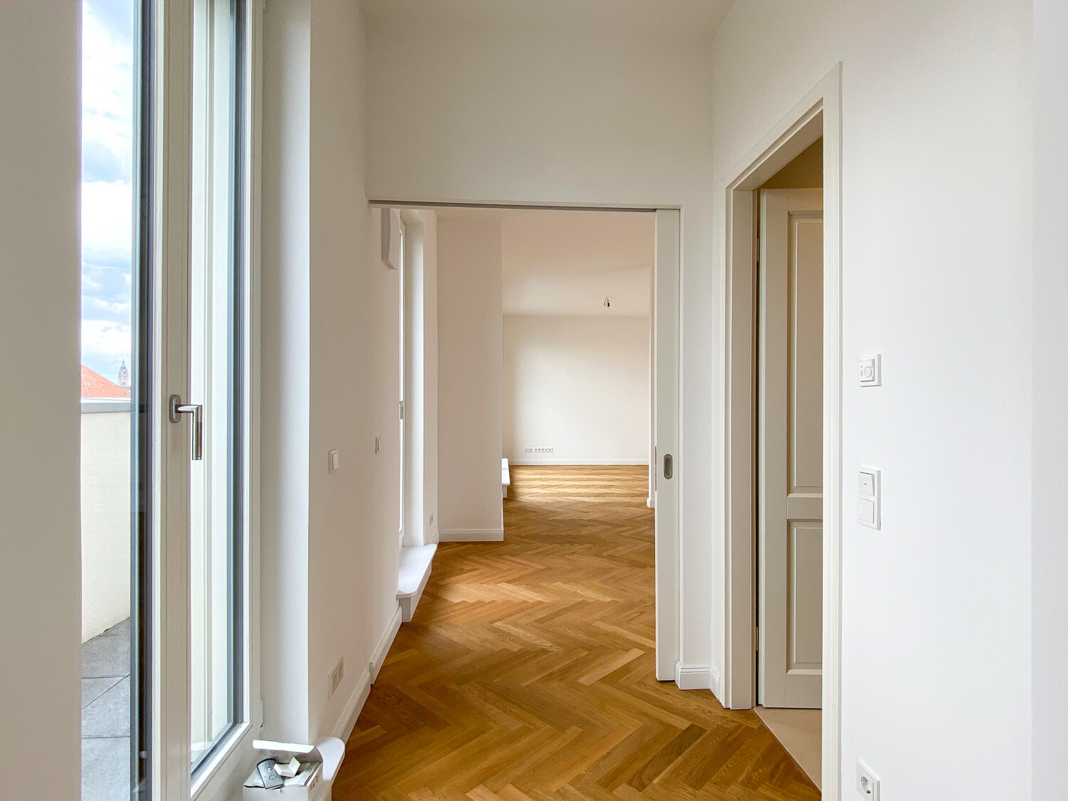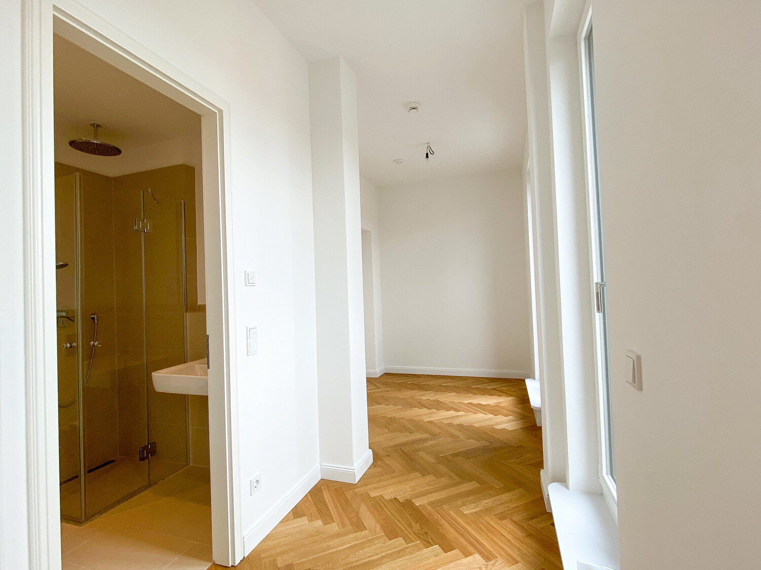 Fertiggestellt wurde dieses Ensemble im Jahr 2020 und es steht nun diese großzügige Wohnung im Erstbezug zum Verkauf. Die Erschließung der 82 Wohnungen erfolgt dabei über drei repräsentative Eingangsbereiche. Die klassische Ästhetik, welche außen sichtbar ist, setzt sich innen fort. Erkennbar ist dies an der Innenarchitektur der Foyers, die stilgerecht konzipiert sind: Mehrfarbige Natursteinböden, holzvertäfelte Wandfelder und angenehme Leuchten erwecken Erinnerungen an elegante Stadtresidenzen früherer Zeiten. Auf den Komfort der Moderne muss dabei aber nicht verzichtet werden, denn das neue Gebäude erhielt auch eine Tiefgarage, welche über zwei Autoaufzüge erschlossen wird. Die 39 Stellplätze befinden sich auf einem modernen Parksystem. Der gemütliche Innenhof wird gemeinschaftlich genutzt.
