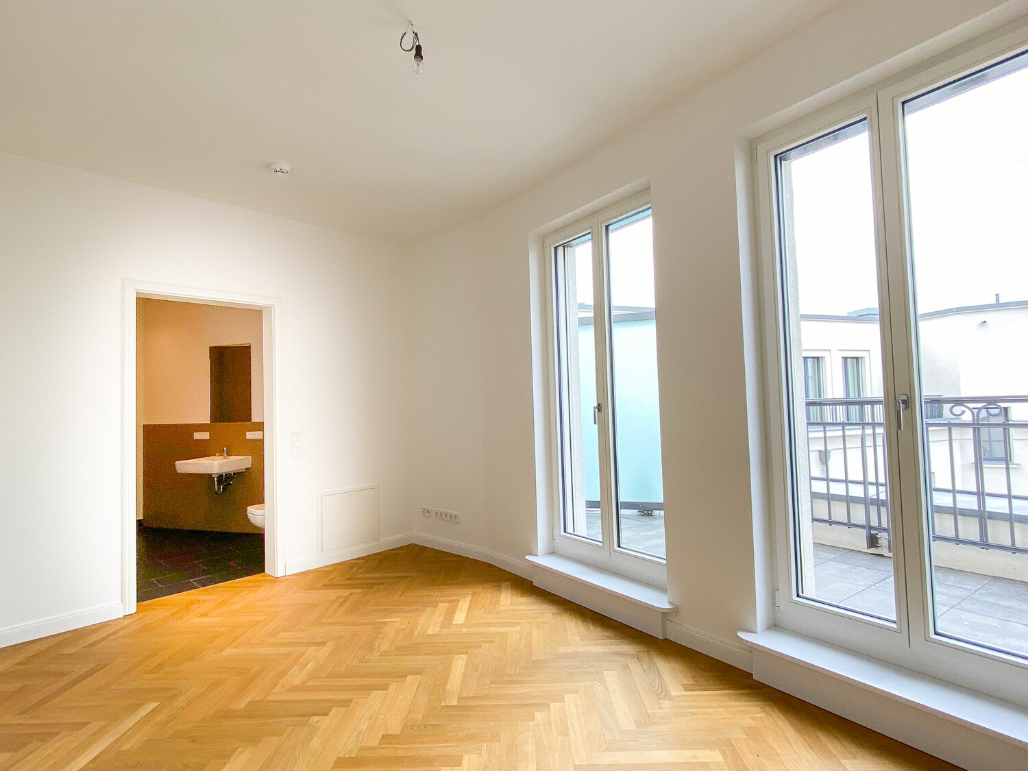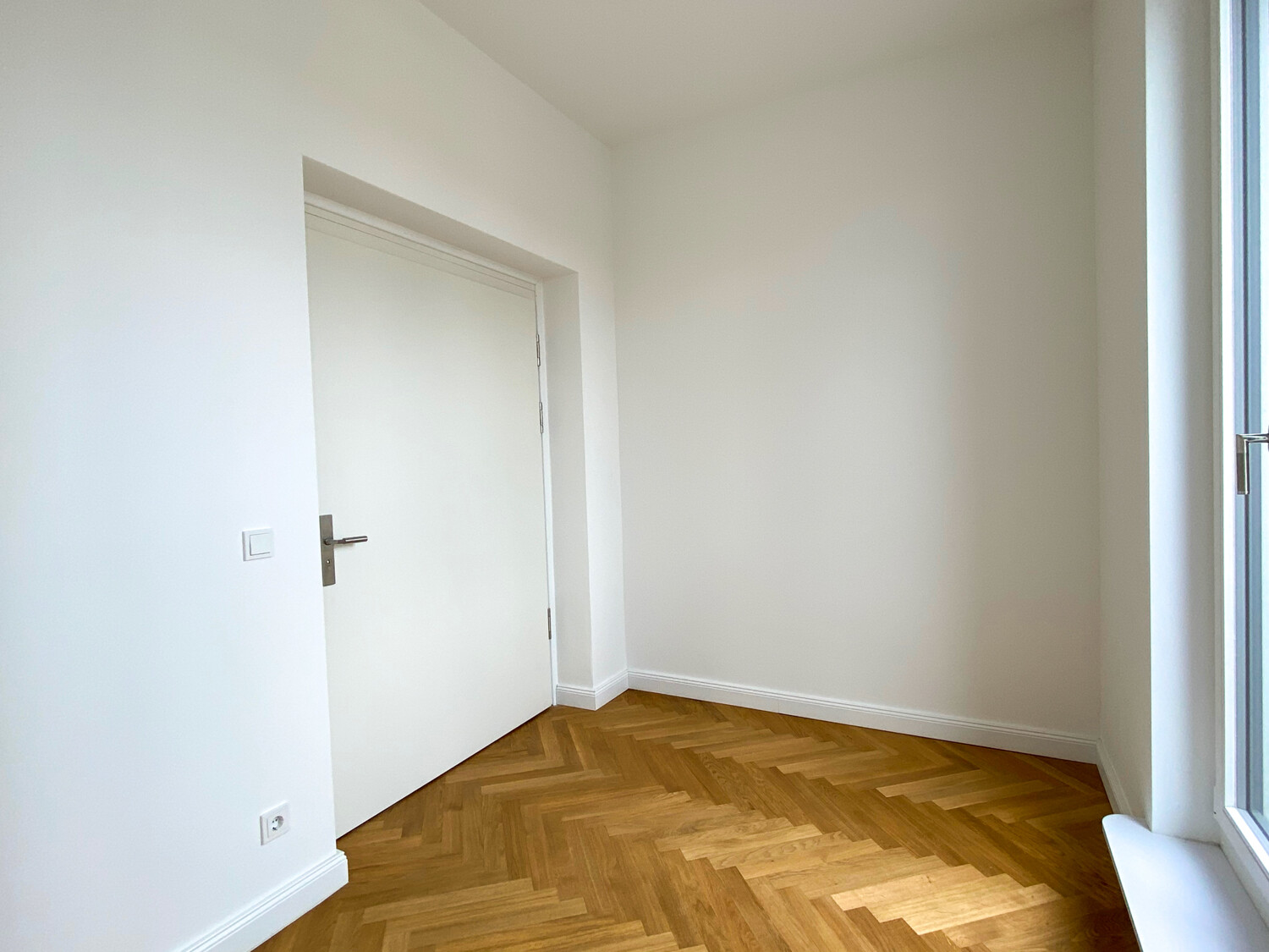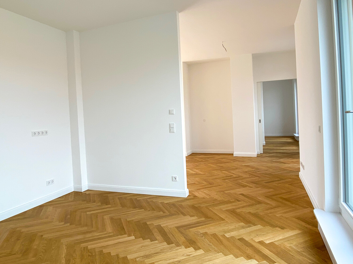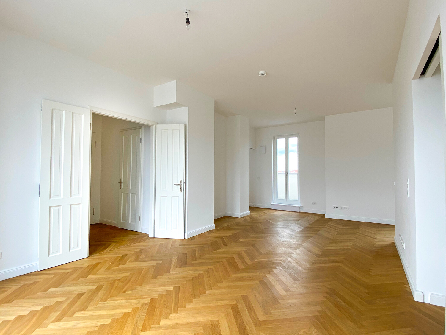 Fertiggestellt wurde dieses Ensemble im Jahr 2020 und es steht nun diese großzügige Wohnung im Erstbezug zum Verkauf. Die Erschließung der 82 Wohnungen erfolgt dabei über drei repräsentative Eingangsbereiche. Die klassische Ästhetik, welche außen sichtbar ist, setzt sich innen fort. Erkennbar ist dies an der Innenarchitektur der Foyers, die stilgerecht konzipiert sind: Mehrfarbige Natursteinböden, holzvertäfelte Wandfelder und angenehme Leuchten erwecken Erinnerungen an elegante Stadtresidenzen früherer Zeiten. Auf den Komfort der Moderne muss dabei aber nicht verzichtet werden, denn das neue Gebäude erhielt auch eine Tiefgarage, welche über zwei Autoaufzüge erschlossen wird. Die 39 Stellplätze befinden sich auf einem modernen Parksystem. Der gemütliche Innenhof wird gemeinschaftlich genutzt.