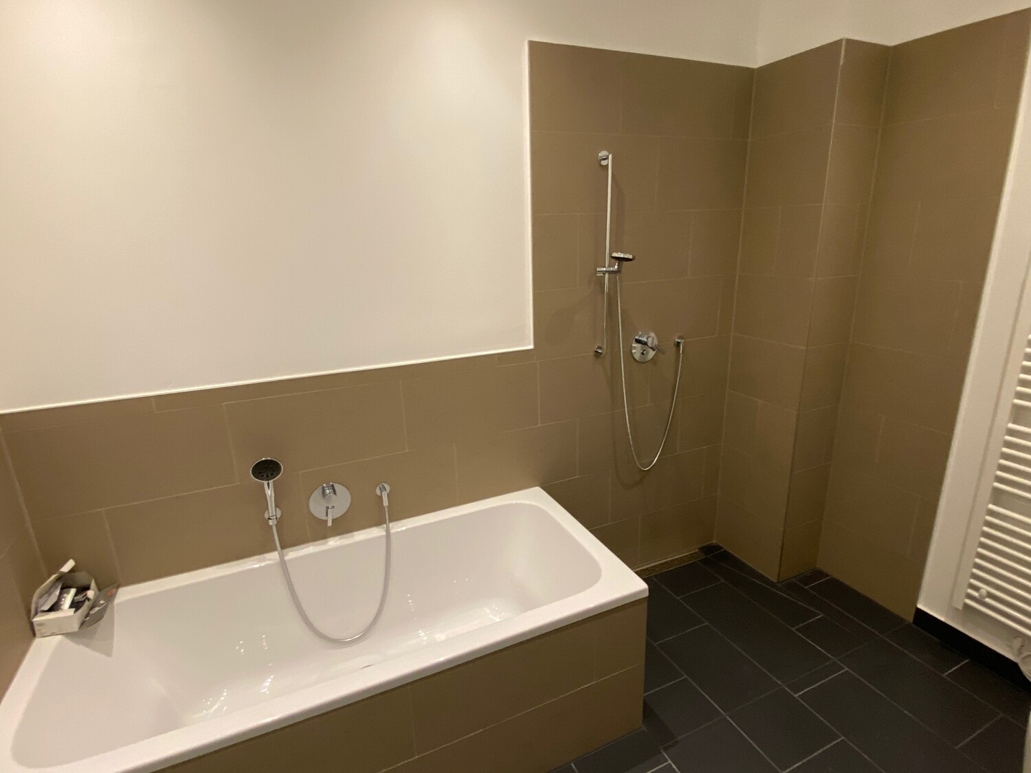 Bad 1: Wanne, ebenerdige Dusche mit Rainshower, Spiegel, WC, Waschitisch