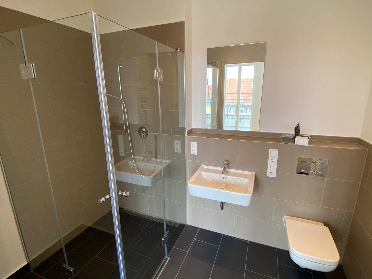 Die moderne Architektur des Hauses finden Sie auch in der Ausstattung der Wohnung wieder, denn diese überzeugt Sie über ein hochwertiges Eichenparkett, eine wohlige Fußbodenheizung, Bodenkeramik der Marke Villeroy & Boch und hochwertige Badarmaturen. Diese liebevoll ausgesuchten Details verleihen der Wohnung einen zeitlosen Stil. Die hohen, überwiegend bodentiefen Fenster und die weiten Türen vermitteln zudem eine Raumatmosphäre aus Licht und Großzügigkeit und gewähren Ihnen den Zutritt zu den beiden Terrassen.