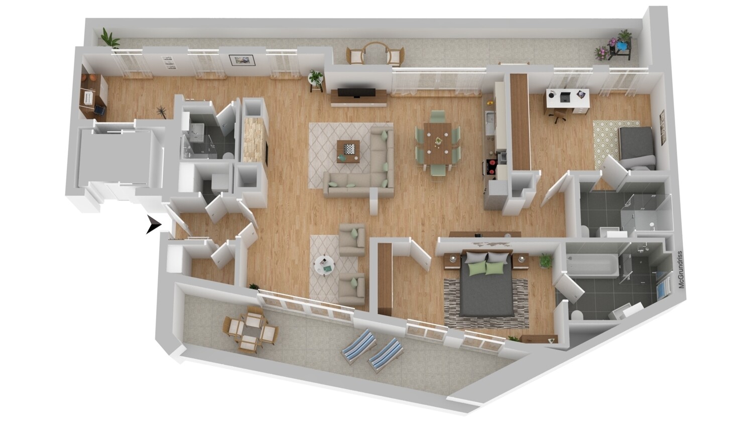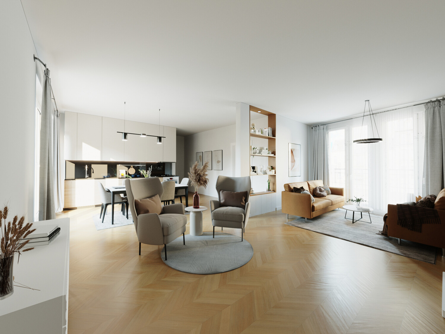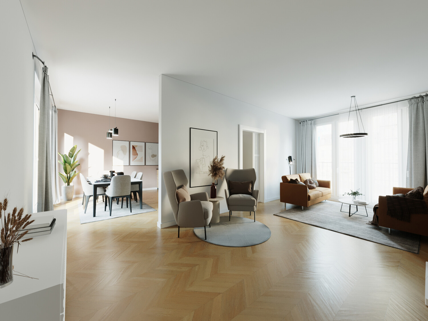 Die ca. 140,34 qm große Wohnung vermittelt anspruchsvolle Wohnqualtiät und verfügt über einen großzügigen Wohn-, Koch- & Essbereich, zwei Schlafzimmer mit Badezimmer ensuite, ein zusätzliches Gäste-Bad und zwei Terrassen. Der Küchenbereich ist dabei derzeit mittels einer Wand vom Wohnbereich abgetrennt. Sollten Sie sich etwas mehr Offenheit wünschen, ließe sich diese entfernen, so dass ein offener Wohn- Essbereich entsteht. Damit Sie sich einen besseren Eindruck diesbezüglich verschaffen können, finden Sie hierzu in der Bilderreihe Visualisierungen und Grundrissvarianten.