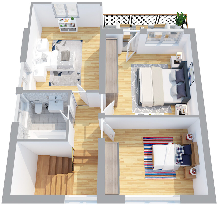 Im Erdgeschoss befindet sich zudem ein Badezimmer (Dusche) mit Tageslicht. Eine Etage höher sind die drei Schlafzimmer sowie ein weiteres Wannenbadezimmer mit Fenster angesiedelt. Vom größten Schlafzimmer haben Sie zudem Zutritt auf den Balkon.