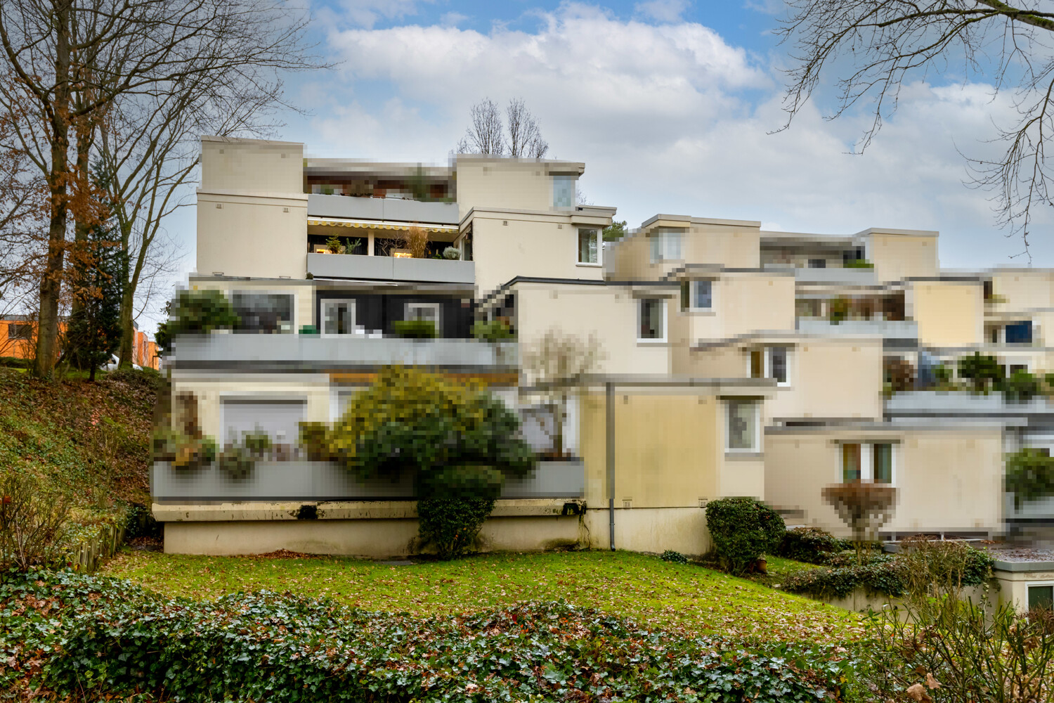 Das Terrassenhaus aus dem Baujahr 1972 überzeugt mit seiner außergewöhnlichen Architektur und liegt verkehrsberuhigt in einer Sackgasse. Auf Grund der Split-Level Bauweise hat man fast das Gefühl in einem eigenen Haus zu wohnen, denn jede Wohnung wird über eine Außentreppe zum eigenen Wohnungseingang geführt.