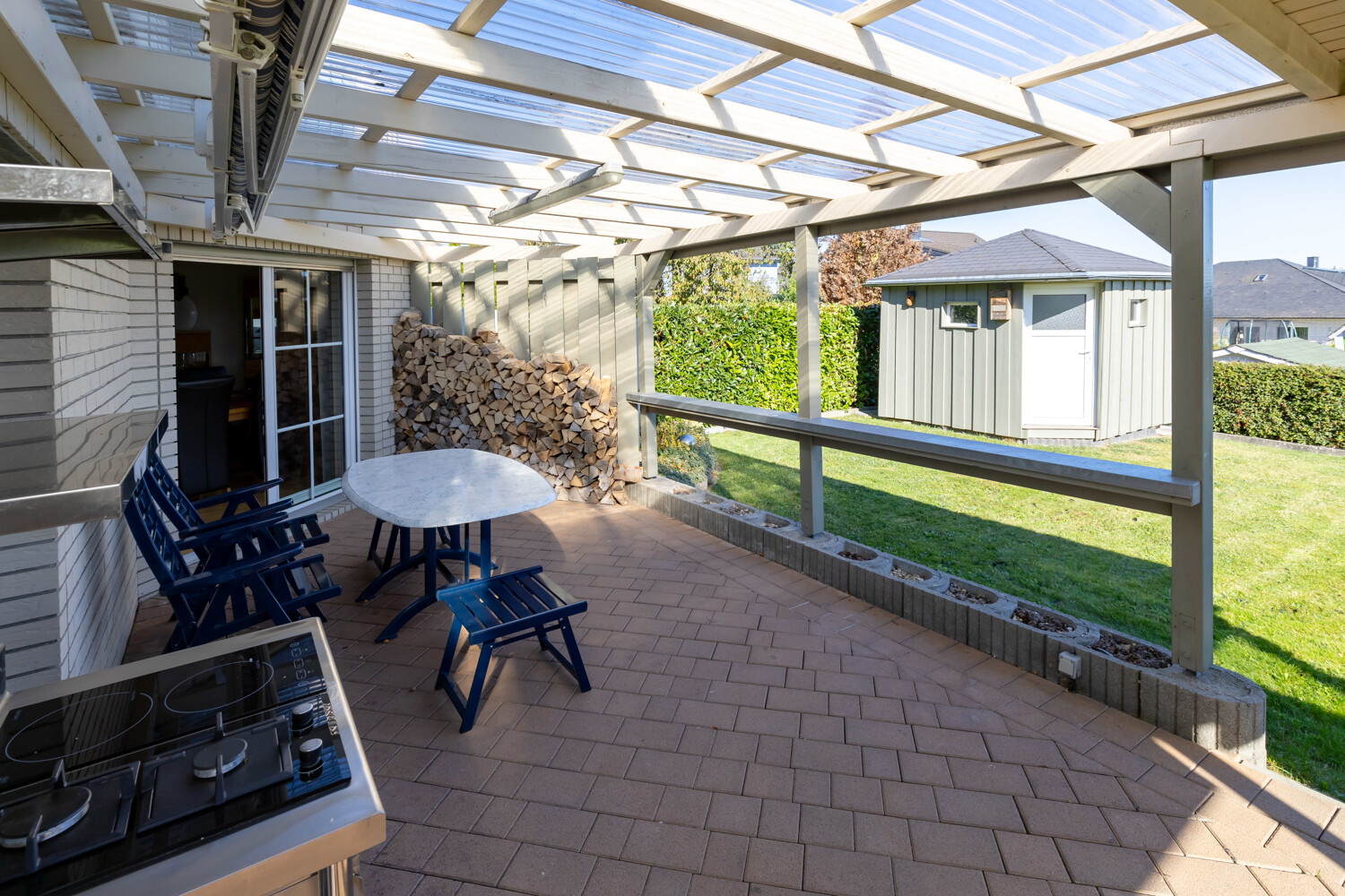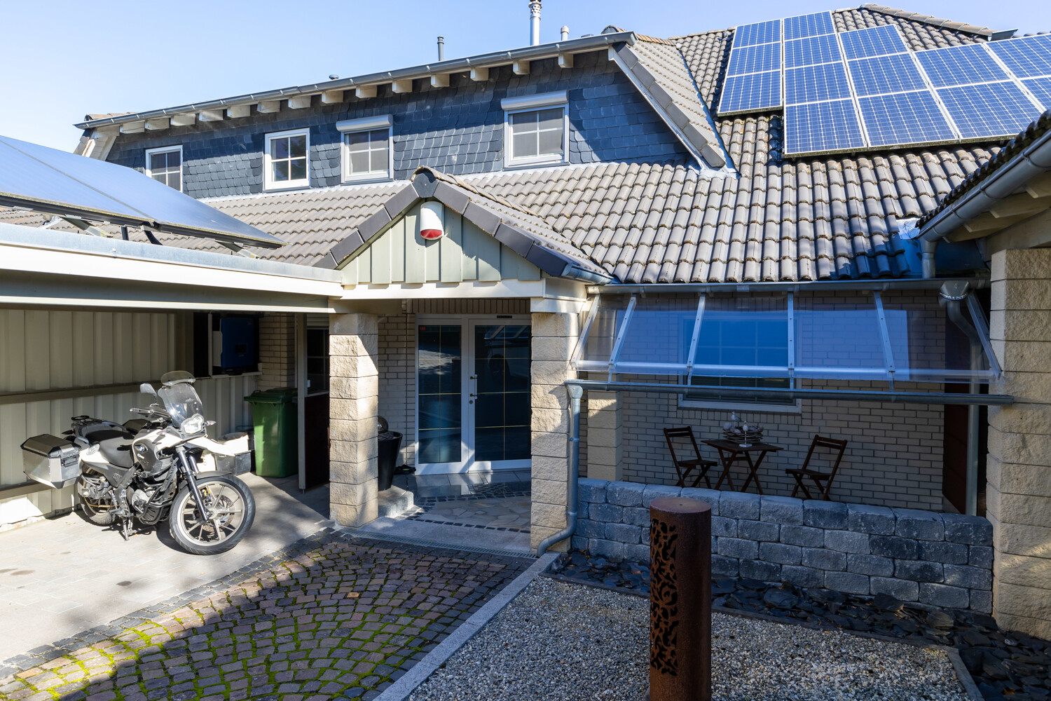 - Überdachung vor dem Haus mit kleinem Sitzplatz