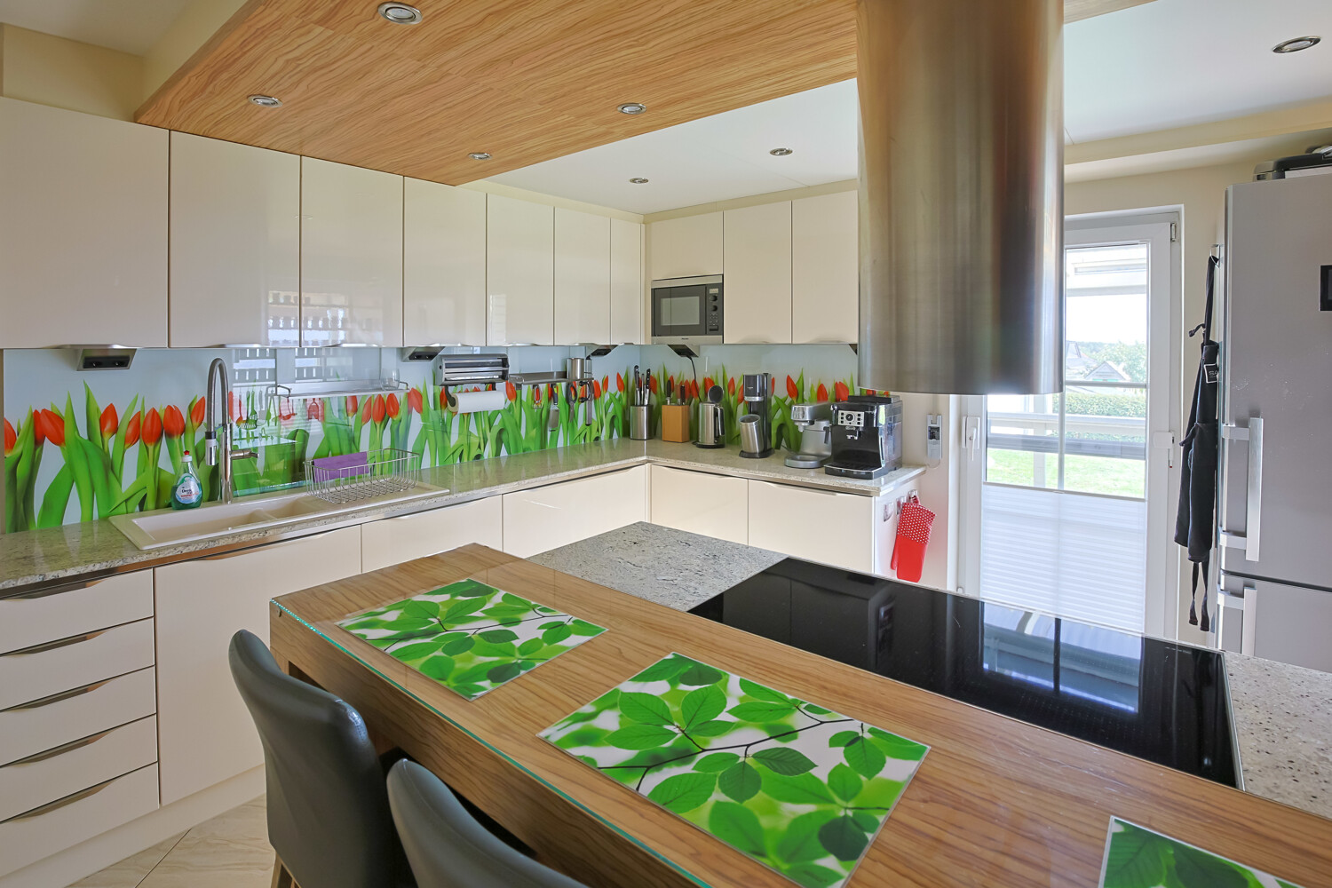 - Küche: mit Elektrogeräten, Kochinsel, Einbauten und Downlights