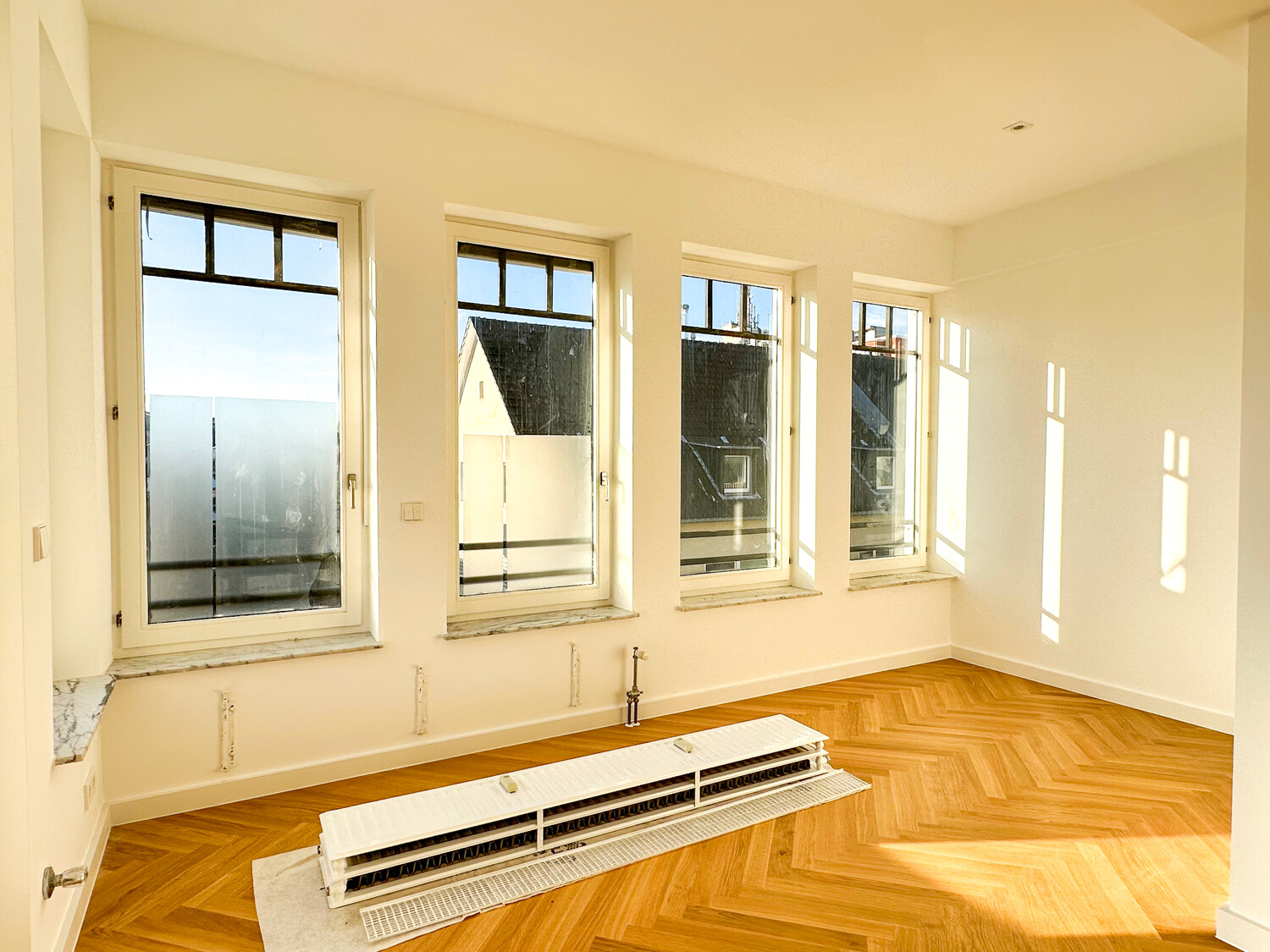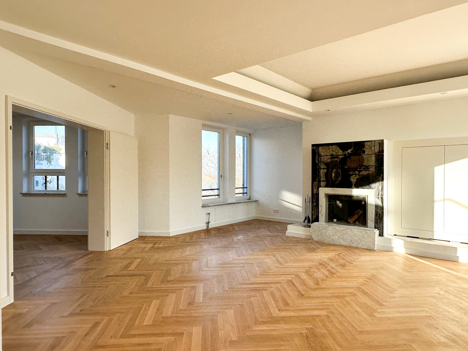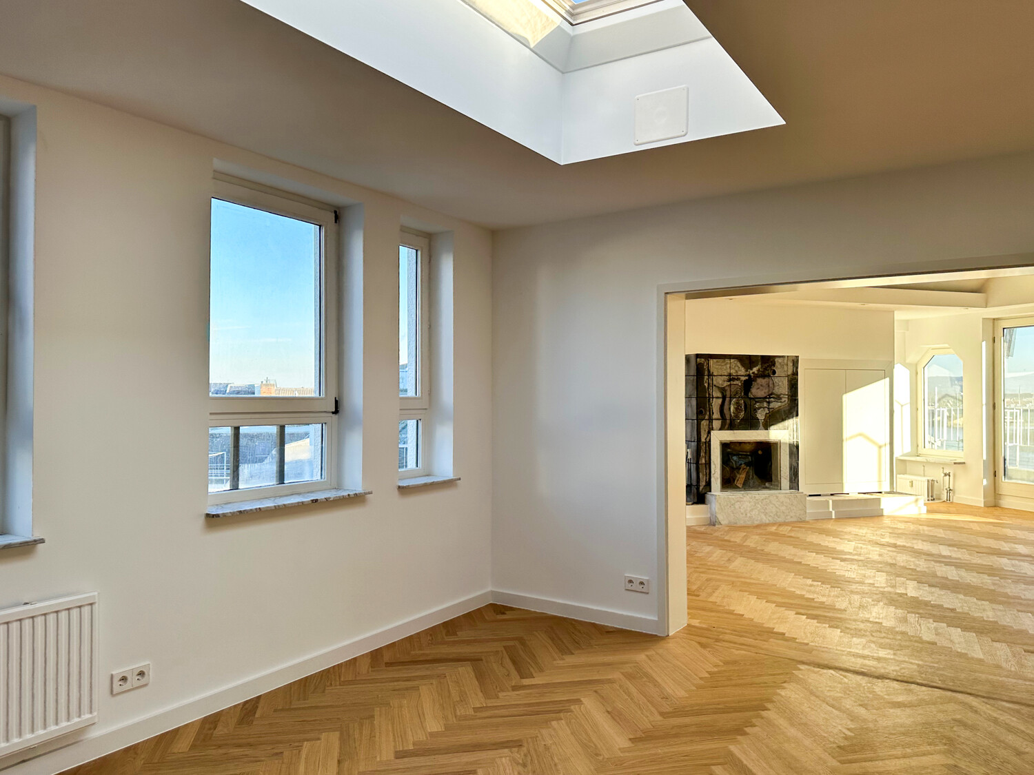 Im gesamten Penthouse wurde hochwertiges Parkett in Fischgrätenoptik verlegt, welches der Wohnung ein luxuriöses und hochwertiges Wohngefühl verleiht. Auch die Bäder wurden im Zuge der Sanierung neu gefliest und mit hochwertigen Sanitärobjekten ausgestattet.