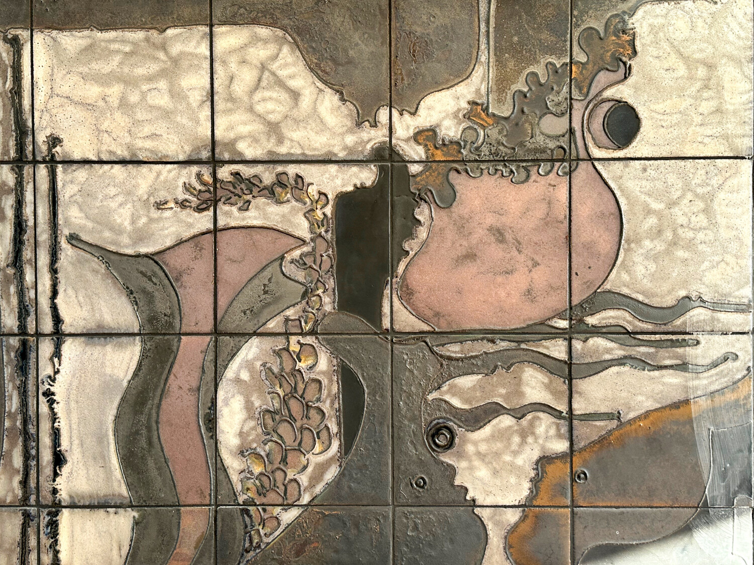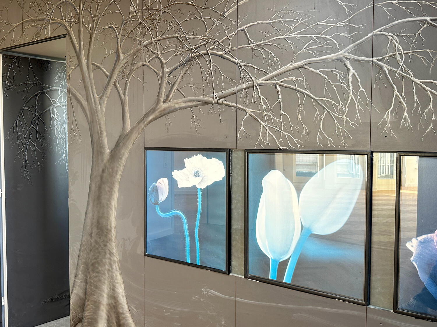 Das an das Wohnzimmer angrenzende Esszimmer besticht mit seinem ausgefallenem handgemalten Gemälde, welches sich über die ganze Wand zur Küche erstreckt.