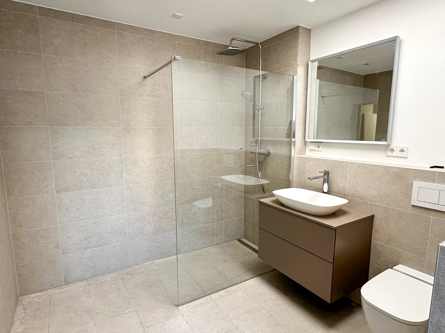 -Bad: Fenster, bodengleiche Regendusche, hochwertiges Desinger-Waschbecken, WC