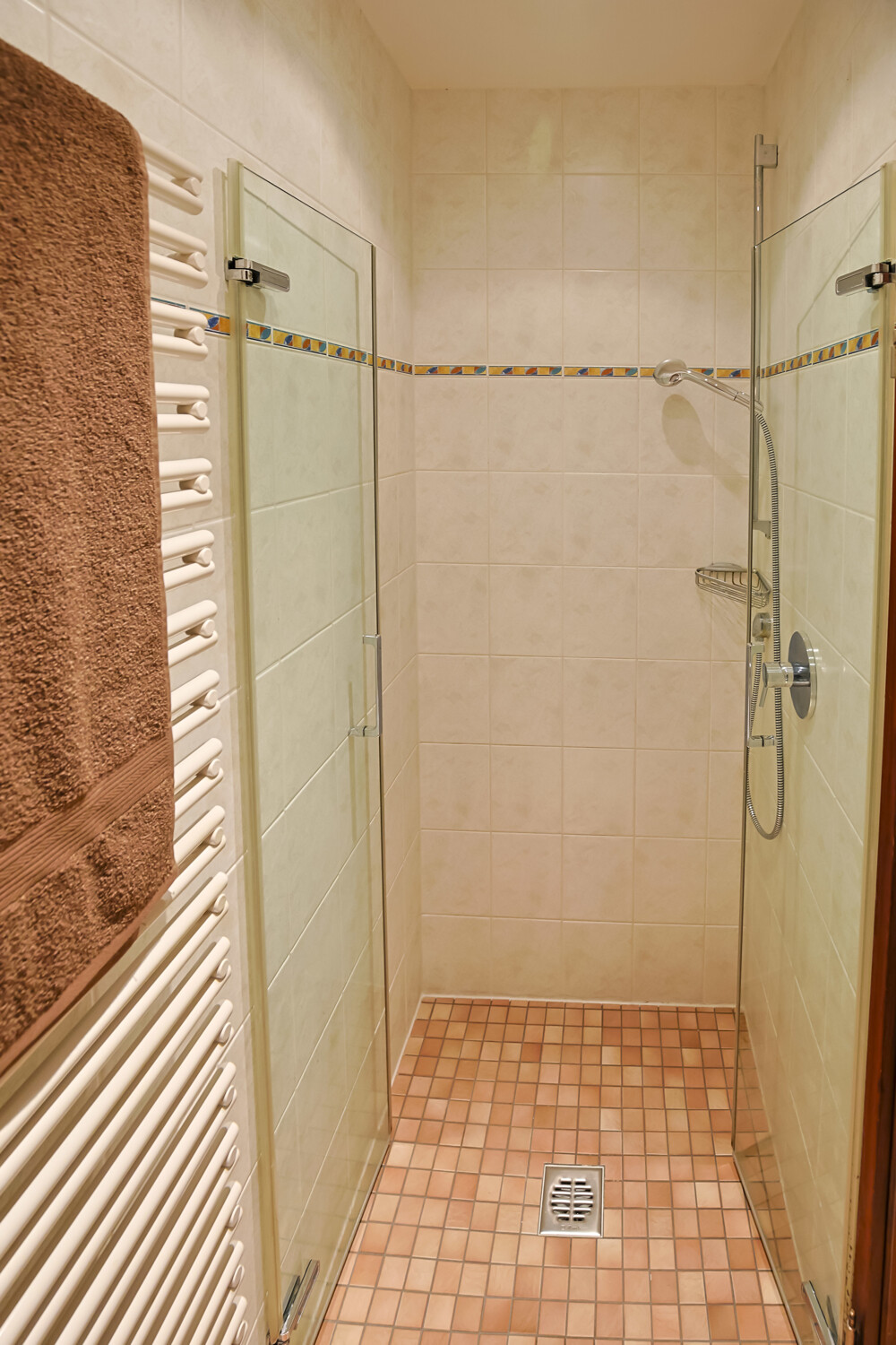 - Badezimmer: Wanne, bodengleiche Dusche und Duschabtrennung, Waschbecken mit Spiegelschrank, WC