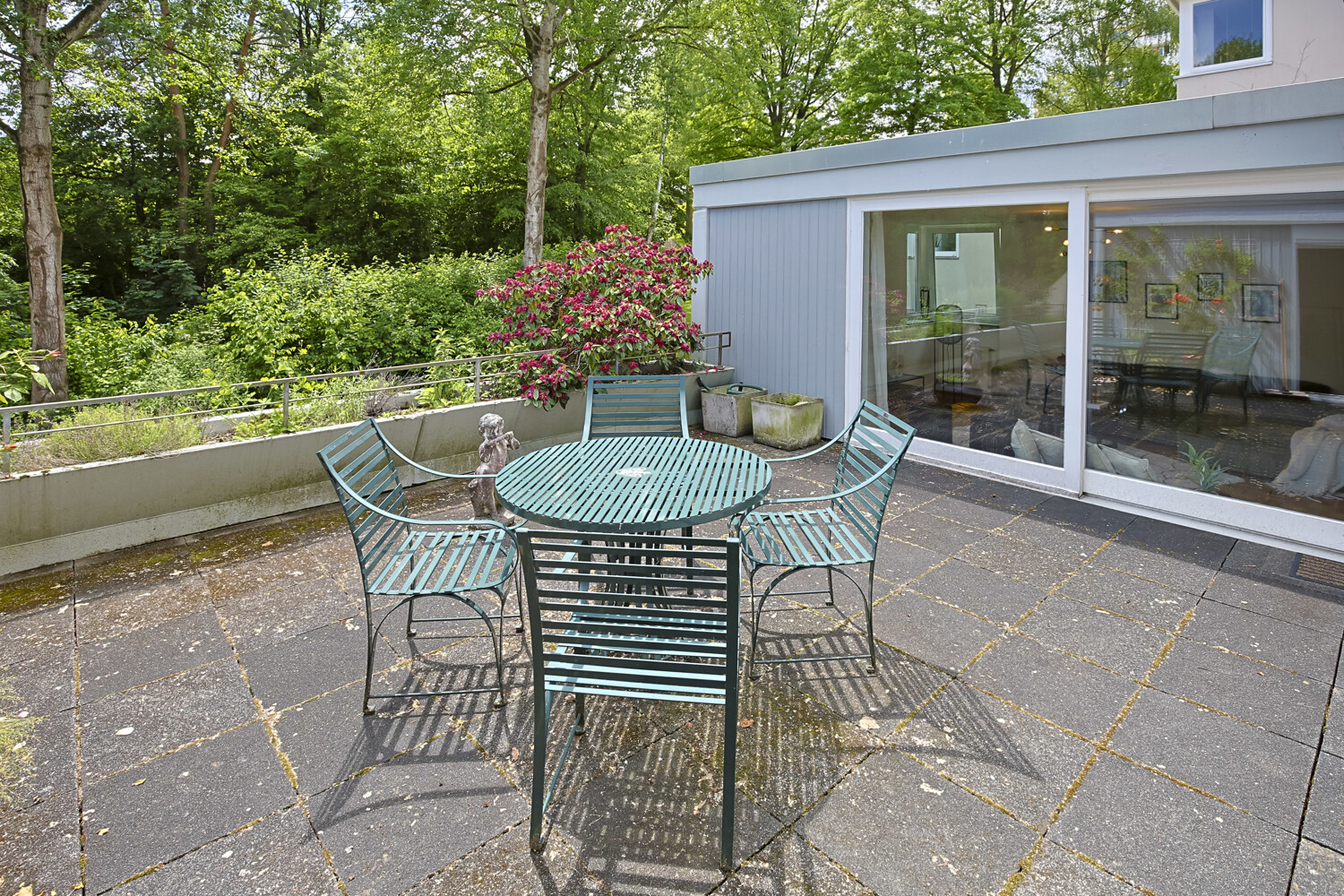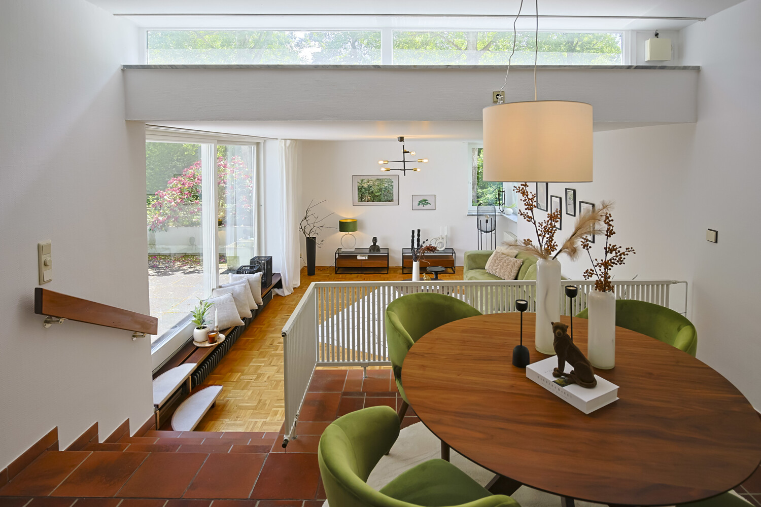 Das Terrassenhaus aus dem Baujahr 1972 überzeugt mit seiner außergewöhnlichen Architektur und liegt verkehrsberuhigt in einer Sackgasse. Auf Grund der Split-Level Bauweise hat man fast das Gefühl in einem eigenen Haus zu wohnen, denn jede Wohnung wird über eine Außentreppe zum eigenen Wohnungseingang geführt. Insgesamt nur neuen Einheiten teilen sich dabei diesen Treppenaufgang. Bei der zu verkaufende Einheit müssen Sie dabei aufgrund der Hanglage ein Geschoss bewältigen.