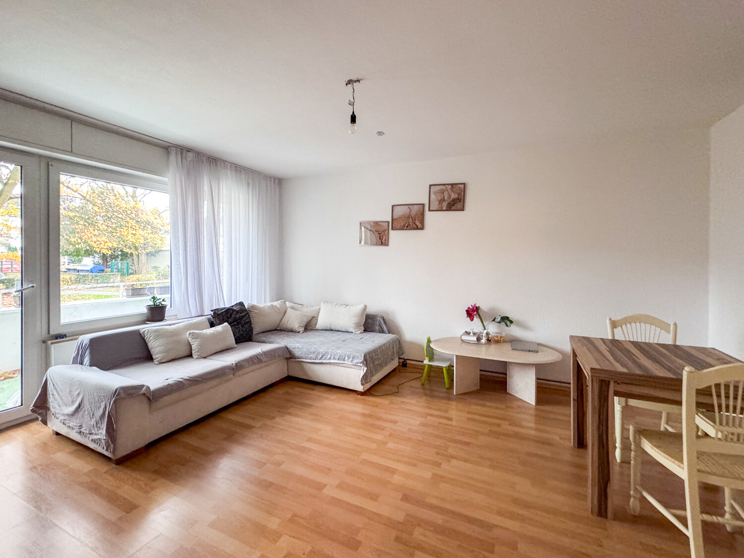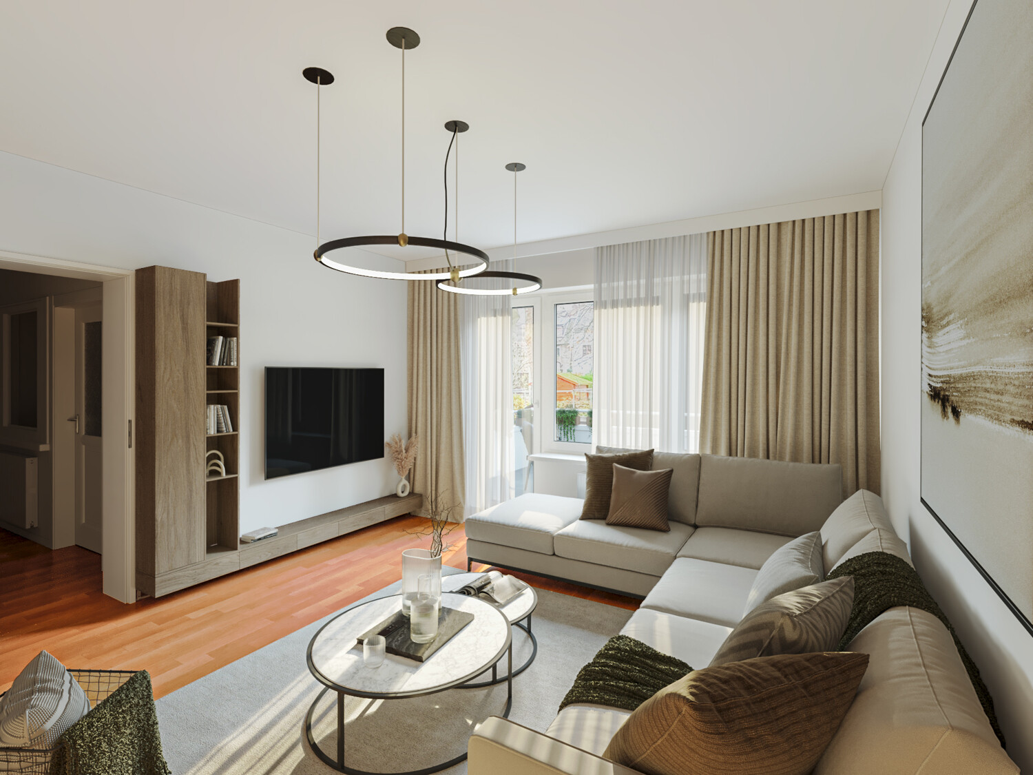 Das Wohnzimmer besticht insbesondere durch den vorgelagerten Balkon, der sich optimal Richtung Süd-Westen ausrichtet. Durch die Geräumigkeit des Raumes findet dort problemlos eine Couchgarnitur Platz.