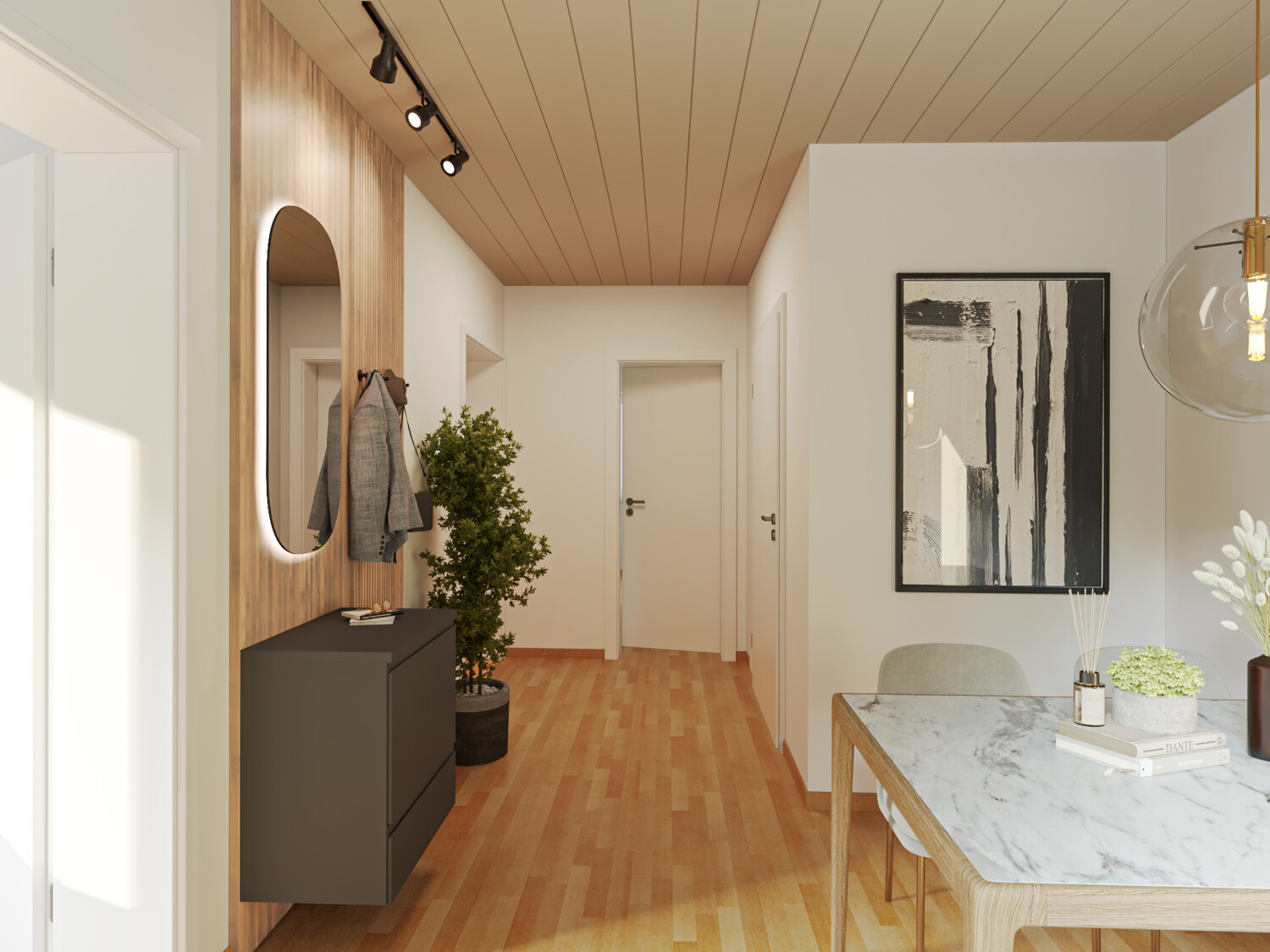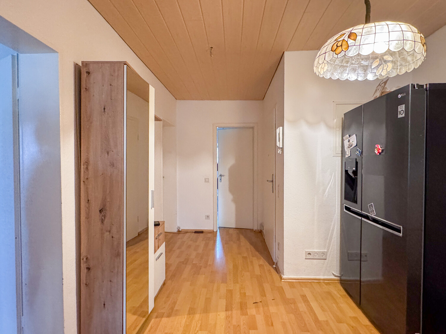 Beim Betreten der etwa 58 qm großen Wohnung werden Sie von einer geräumigen Diele empfangen, von der aus Sie Zugang zum Wohnzimmer, Küche, dem Schlafzimmer und dem Bad haben. Links neben dem Eingang wir die Diele breiter, sodass Sie dort bequem einen Esstisch unterbringen können. Von dort aus haben Sie zudem Zutritt zur Küche