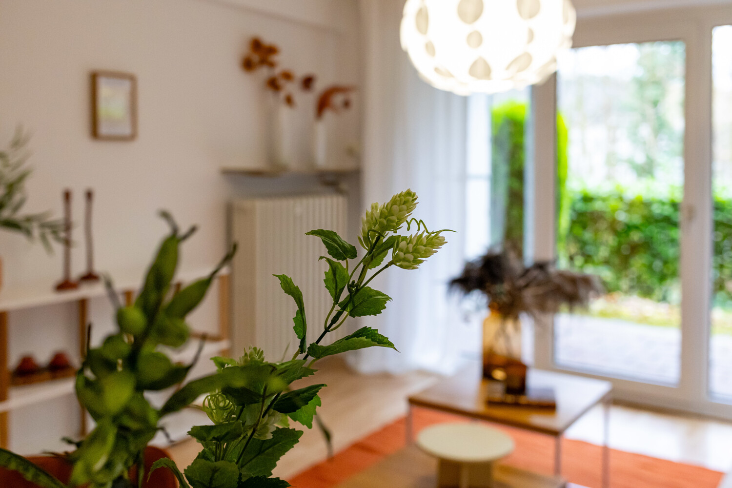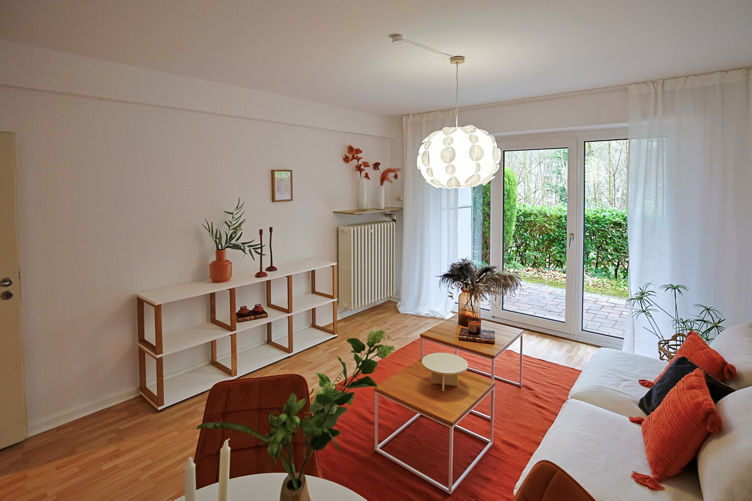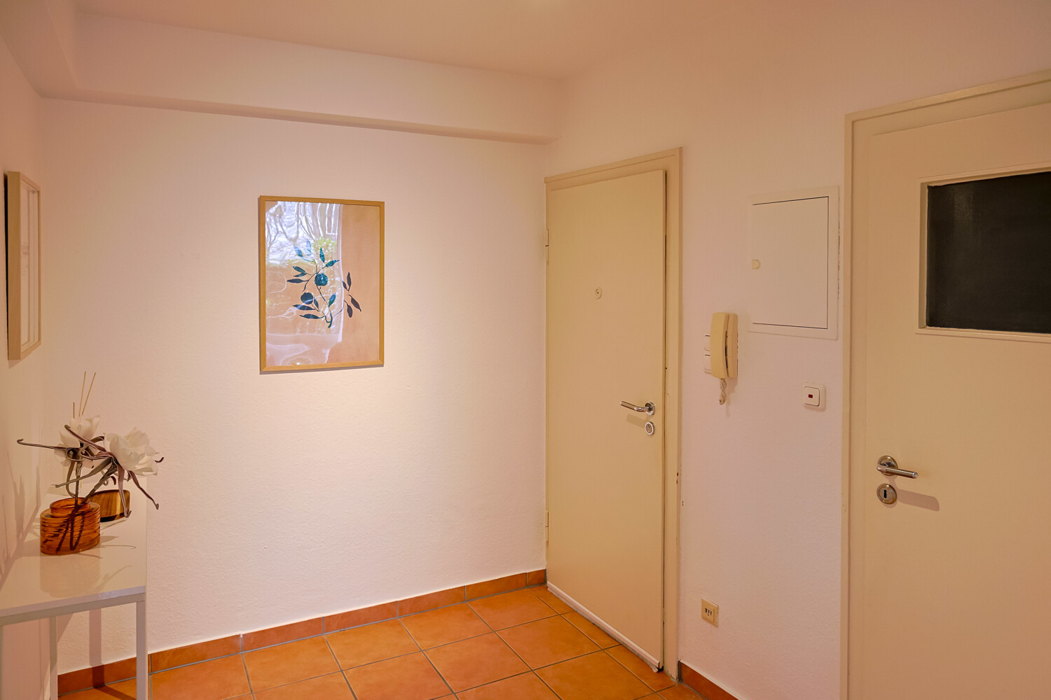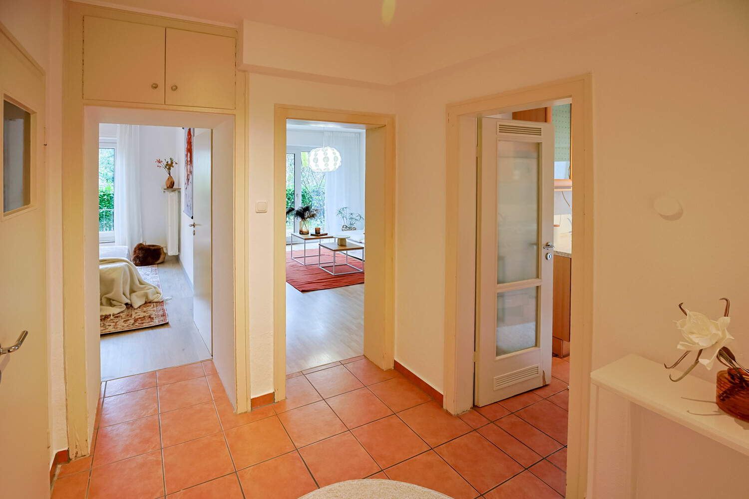 Die etwa 54 m² große Wohnung befindet dabei sich im Gartengeschoss des Siebenparteienhauses. Aufgrund der leichten Hanglage des Gebäudes gehen Sie zur Wohnungeingangstüre ein paar Stufen runter.