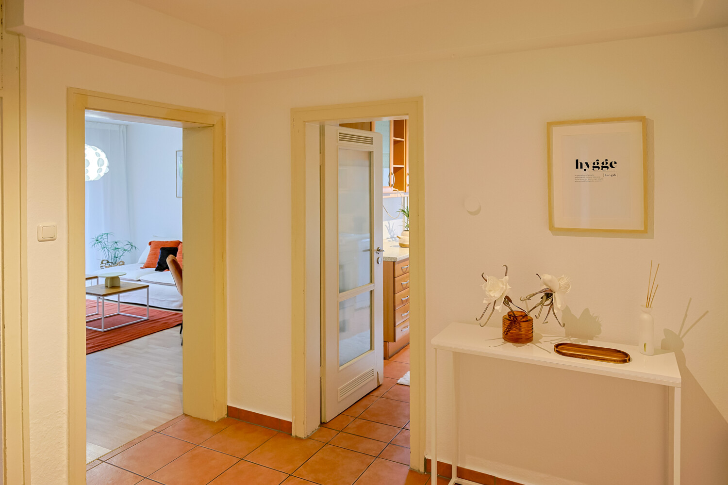 Beim Betreten der etwa 54 qm großen Wohnung werden Sie von einer geräumigen Diele empfangen, von der aus Sie Zugang zum Wohnzimmer, Küche, dem Schlafzimmer und dem Bad haben.