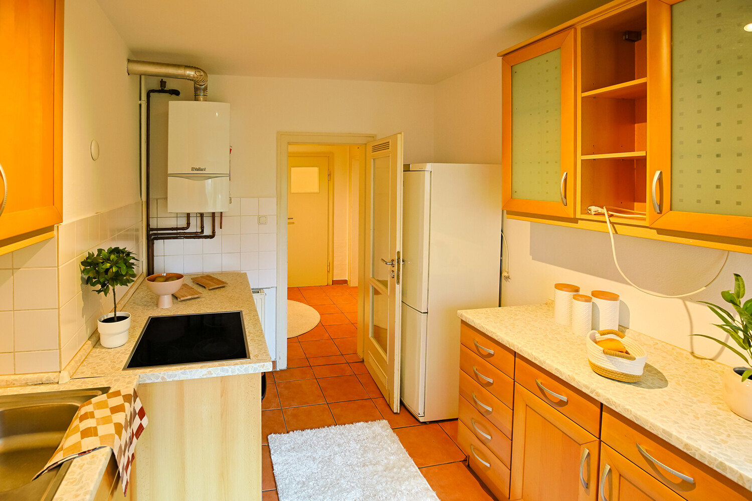 Sowohl das Wohnzimmer als auch das Schlafzimmer richten sich angenehm ruhig Richtung Garten. Vom Wohnzimmer aus haben Sie Zutritt zu der Terrasse und einem kleinen Grünstreifen. Durch die großzügigen Fenster werden die Räume stets in helles Tageslicht getaucht. Die geräumige Küche bietet mit zwei zusätzlichen Abstellkammern genug Platz und Stauraum.