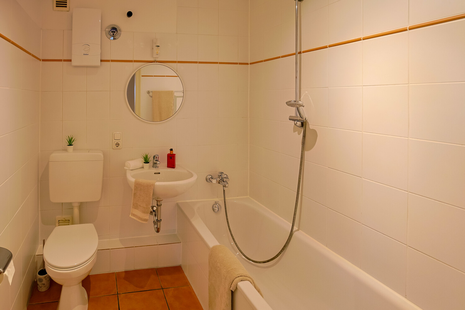 - Bad: Badewanne, Waschtisch, WC, Spiegel