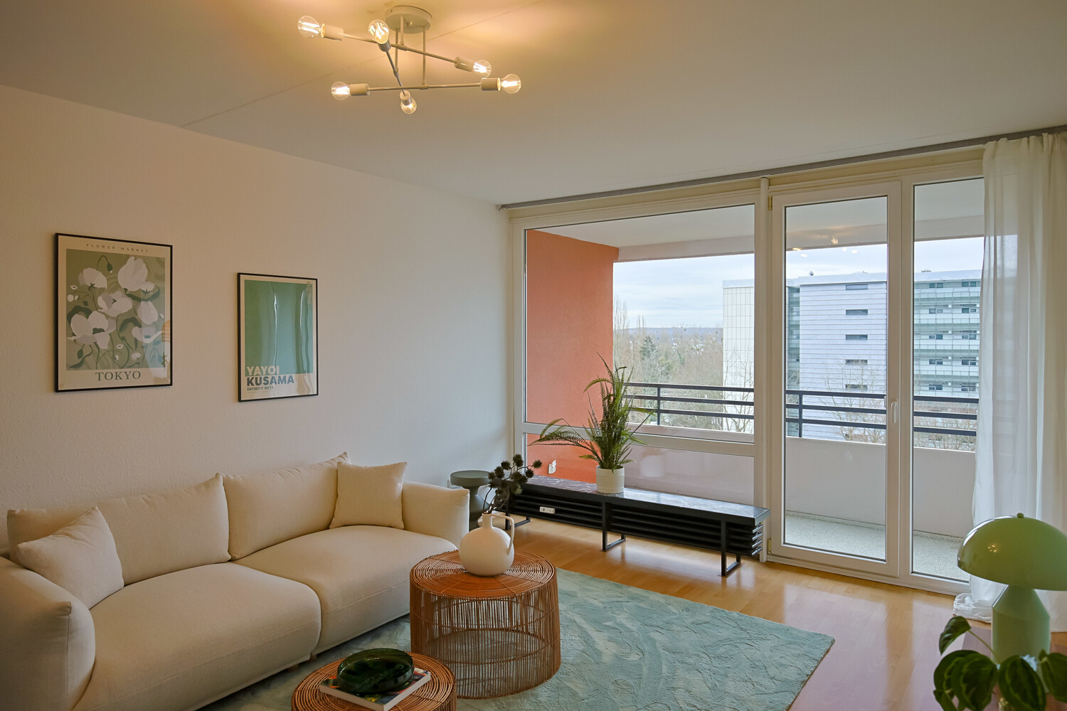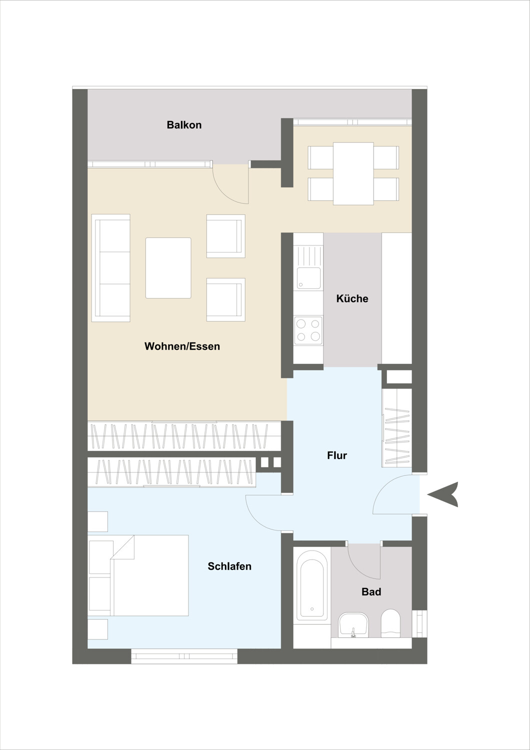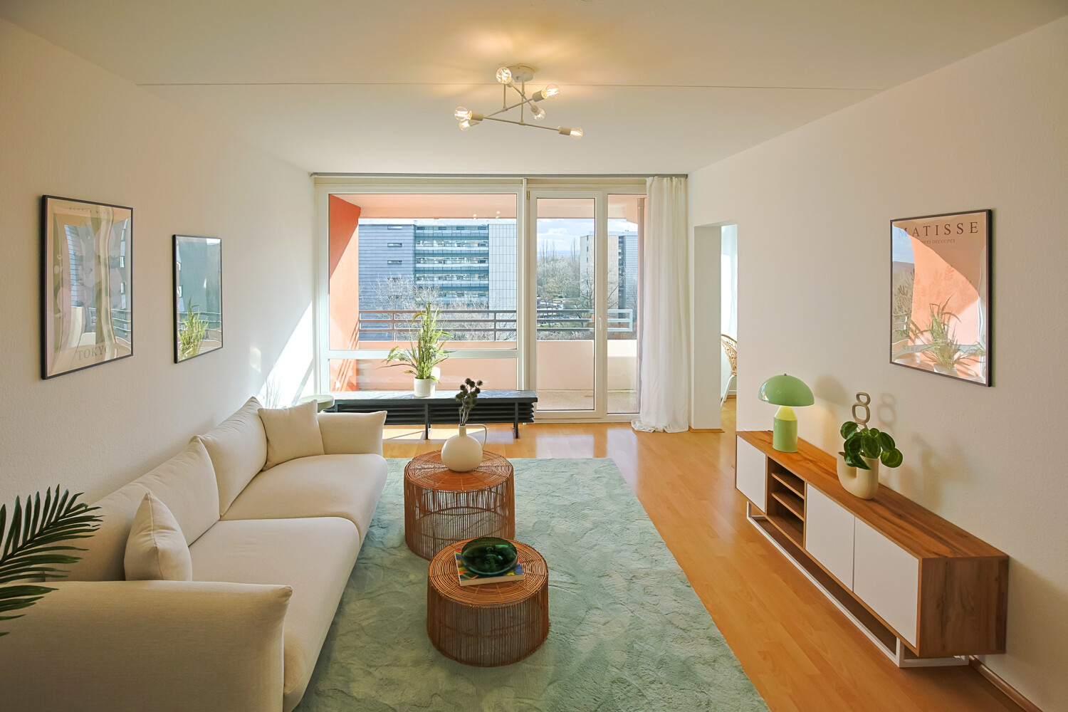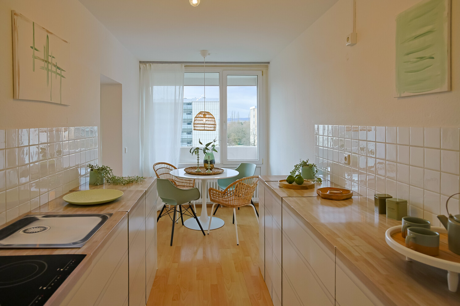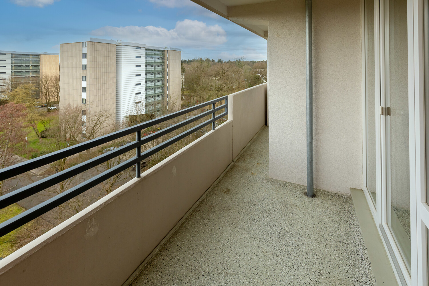 Das Wohnzimmer besticht durch große Fensterfronten, die für ein helles und freundliches Ambiente sorgen. Ein vorgelagerter, nach Süden ausgerichteter Balkon lädt zum Verweilen ein. Die Küche ist sowohl von der Diele als auch durch eine zusätzlichen Durchgang vom Wohnzimmer aus zugänglich und bietet ausreichend Stauraum sowie Platz für einen Esstisch. Das Badezimmer verfügt über eine Badewanne sowie ein kleines Fenster.