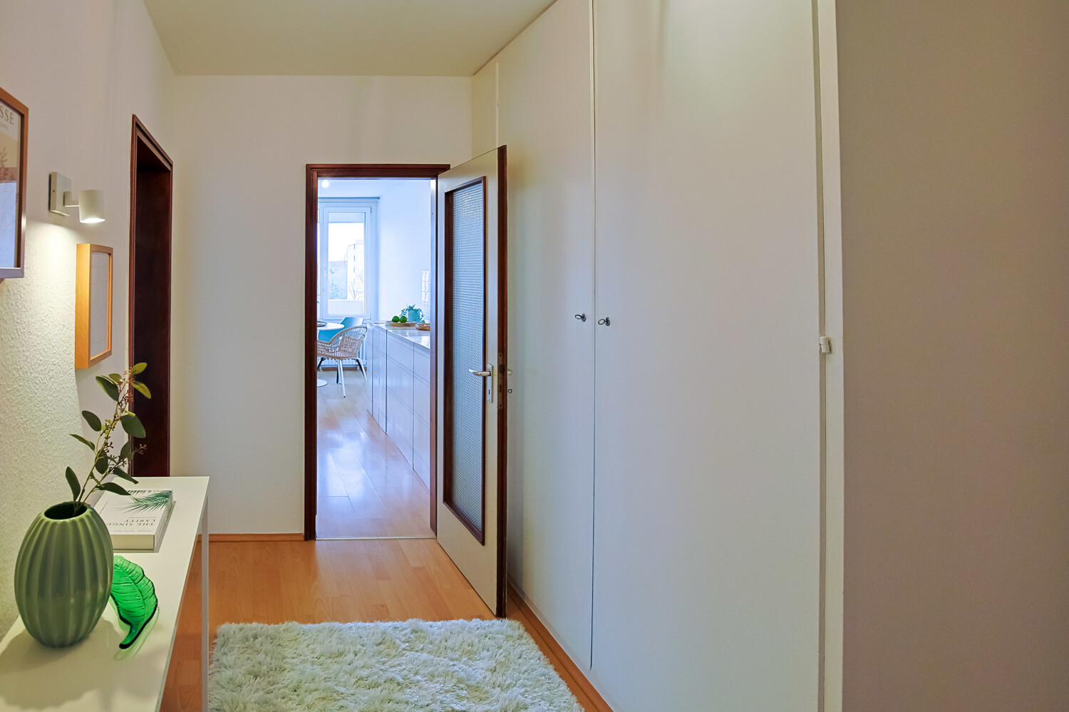 Die zum Verkauf stehende Einheit befindet sich im sechsten Obergeschoss und überzeugt durch eine durchdachte Raumaufteilung. Beim Betreten gelangen Sie in eine kleine Diele mit einem praktischen Einbauschrank. Von hier aus erschließen sich das Wohnzimmer, das Schlafzimmer, die Küche und das Bad.