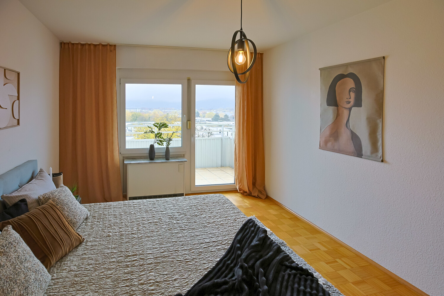 Das große Schlafzimmer mit einem einzigartigen Blick auf das Siebengebirge können Sie sowohl mittels einer Schiebetür über das Wohnzimmer betreten oder über die Diele. Von diesem Zimmer geht der zweite Balkon ab, von wo aus Sie den Sonnenaufgang und das Siebengebirge betrachten können. Das kleinere Schlafzimmer eignet sich gut als Kinder/- Arbeit -oder Gästezimmer.