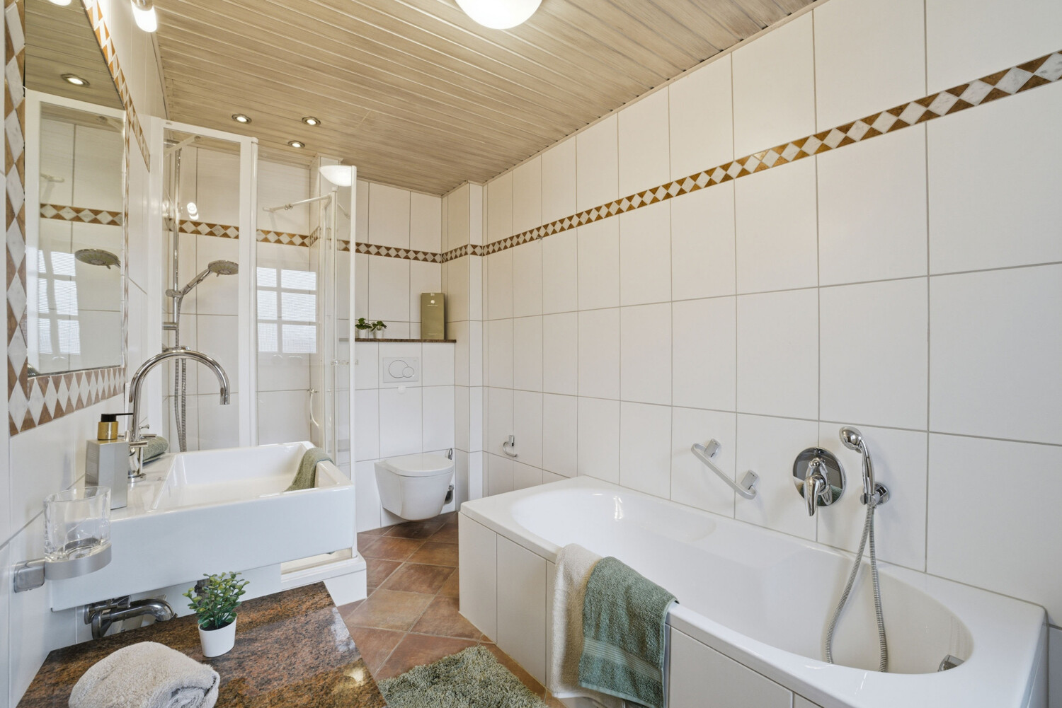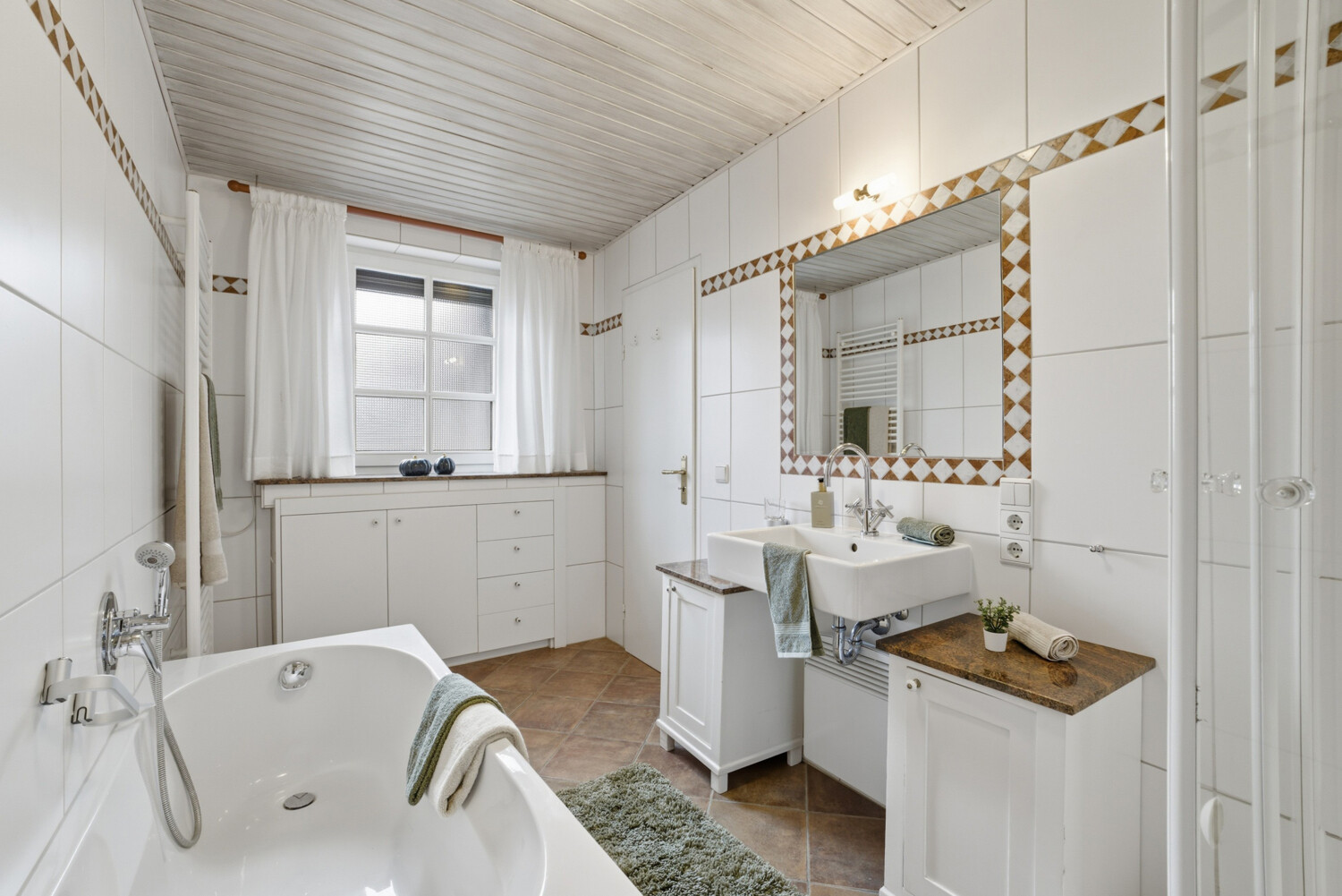 Im ersten Obergeschoss stehen Ihnen drei Schlafzimmer -zwei davon mit Einbauschränken- sowie ein großes Badezimmer zur Verfügung, das sowohl mit einer Badewanne als auch mit einer Dusche ausgestattet ist.