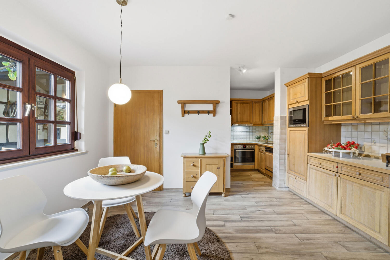 Beim Betreten des Hauses empfängt Sie ein Windfang. Rechts gelangen Sie in den Anbau. Dort befindet sich die großzügige Küche, die ausreichend Platz für eine gemütliche Essecke bietet. Ein kleiner Flur führt Sie weiter zu einem Badezimmer und einem Hauswirtschafts-/Arbeitszimmer. Von hier aus haben Sie ebenfalls Zugang zum Garten. Der Anbau verfügt darüber hinaus über einen weiteren Abstellraum und einen Spitzboden, der zusätzlich Stauraum bietet.