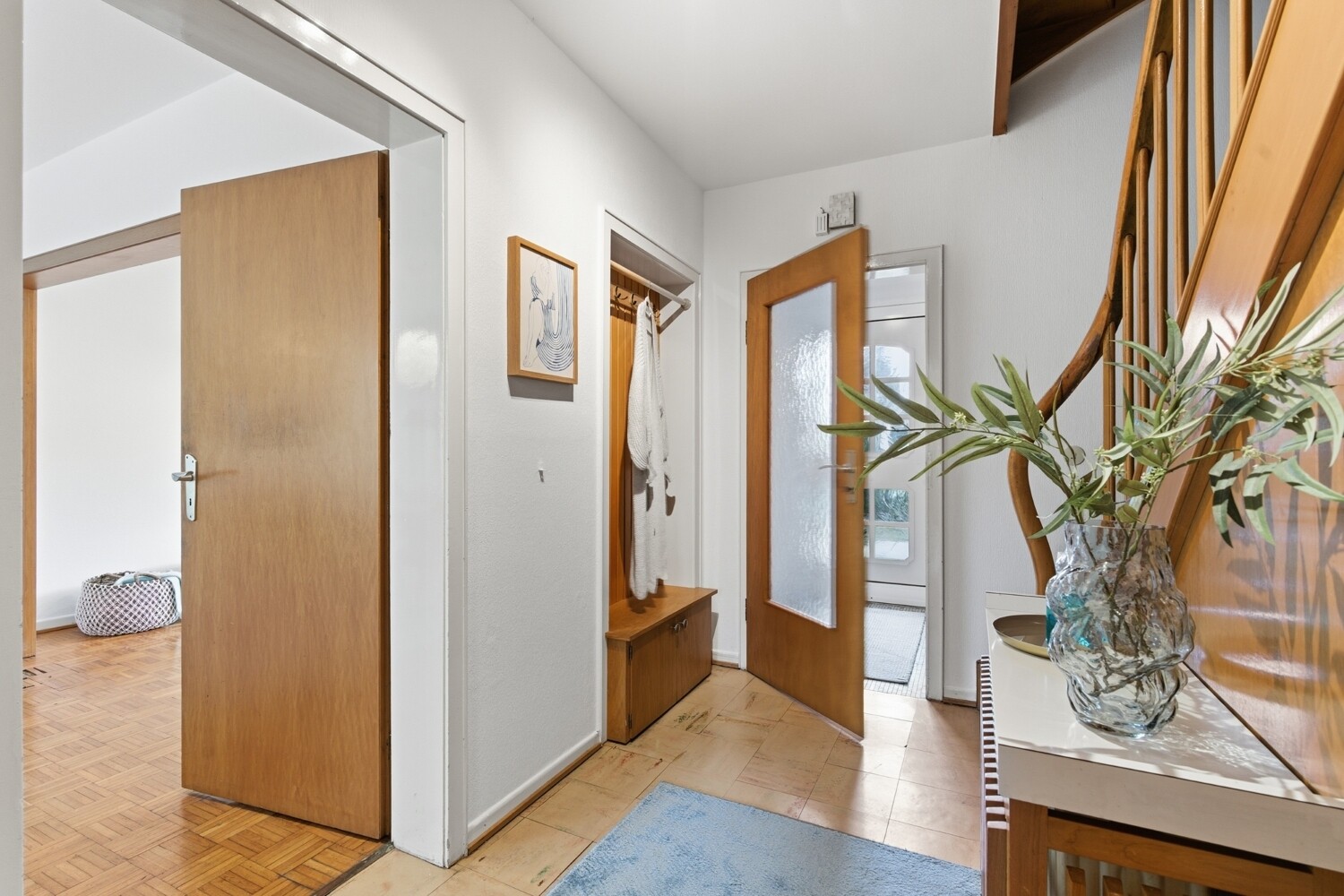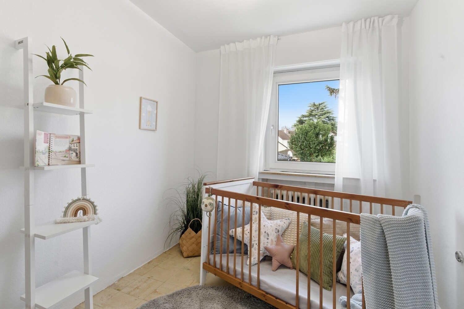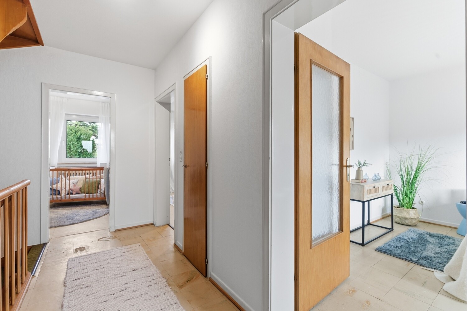 Im Obergeschoss stehen drei gut geschnittene Schlafzimmer sowie ein Tageslichtbad zur Verfügung. Die charmante Holztreppe führt weiter ins Dachgeschoss, wo ein großzügiger Hobbyraum zusätzlichen Nutzungsspielraum bietet. Eine Vergrößerung des Raumes mittels Einbau von Gauben wäre problemlos möglich, denn Nachbarhäuser in der Reihe haben dies bereits umgesetzt.